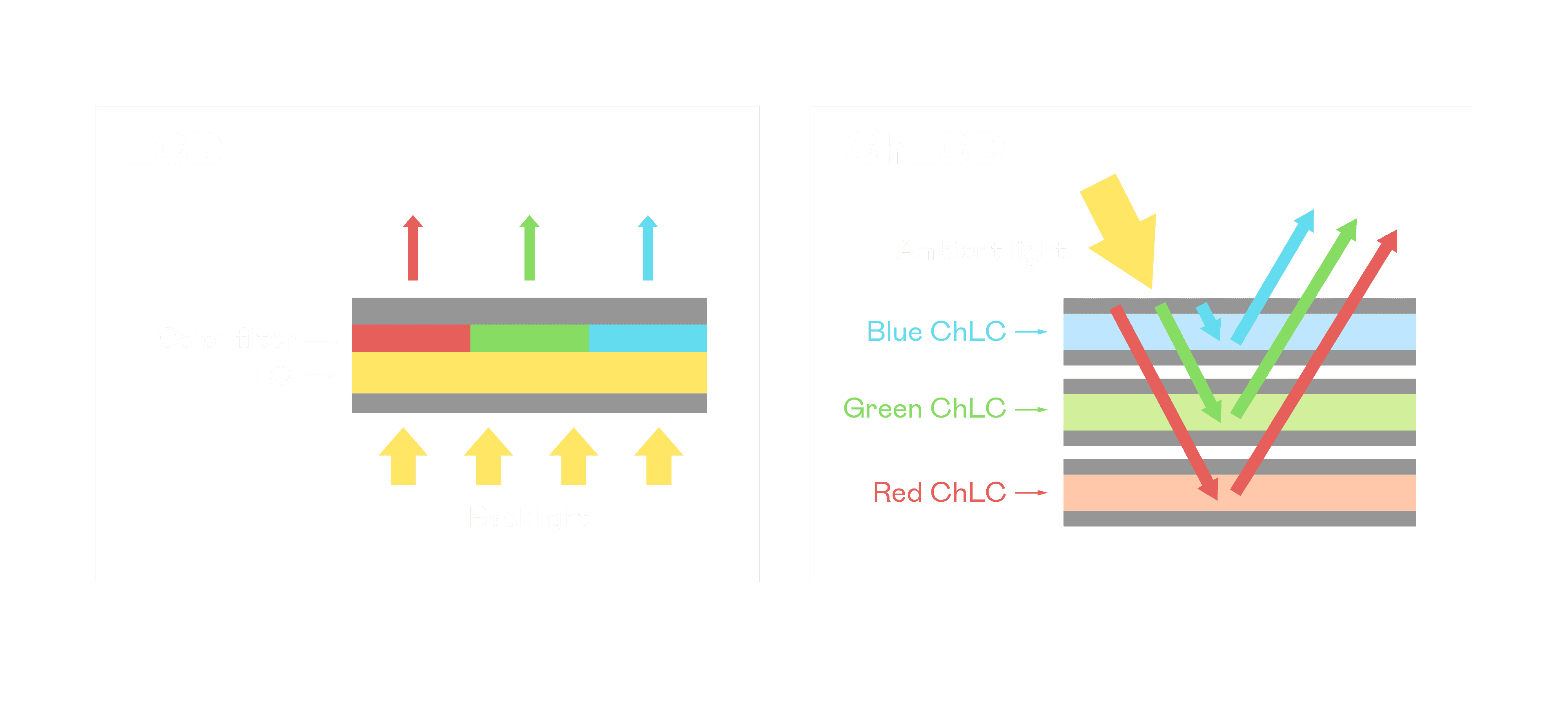ChLCD 胆固醇液晶就如同纸张一样,,,透过反射环境光来显示影像,,,因此长时间观看不易造成人眼视觉疲劳,,,,可达到护眼效果。。。。当处于户外阳光下使用,,,LCD 影像容易失真而不易观看,,,但胆固醇液晶仍可维持较佳的影像品质。。