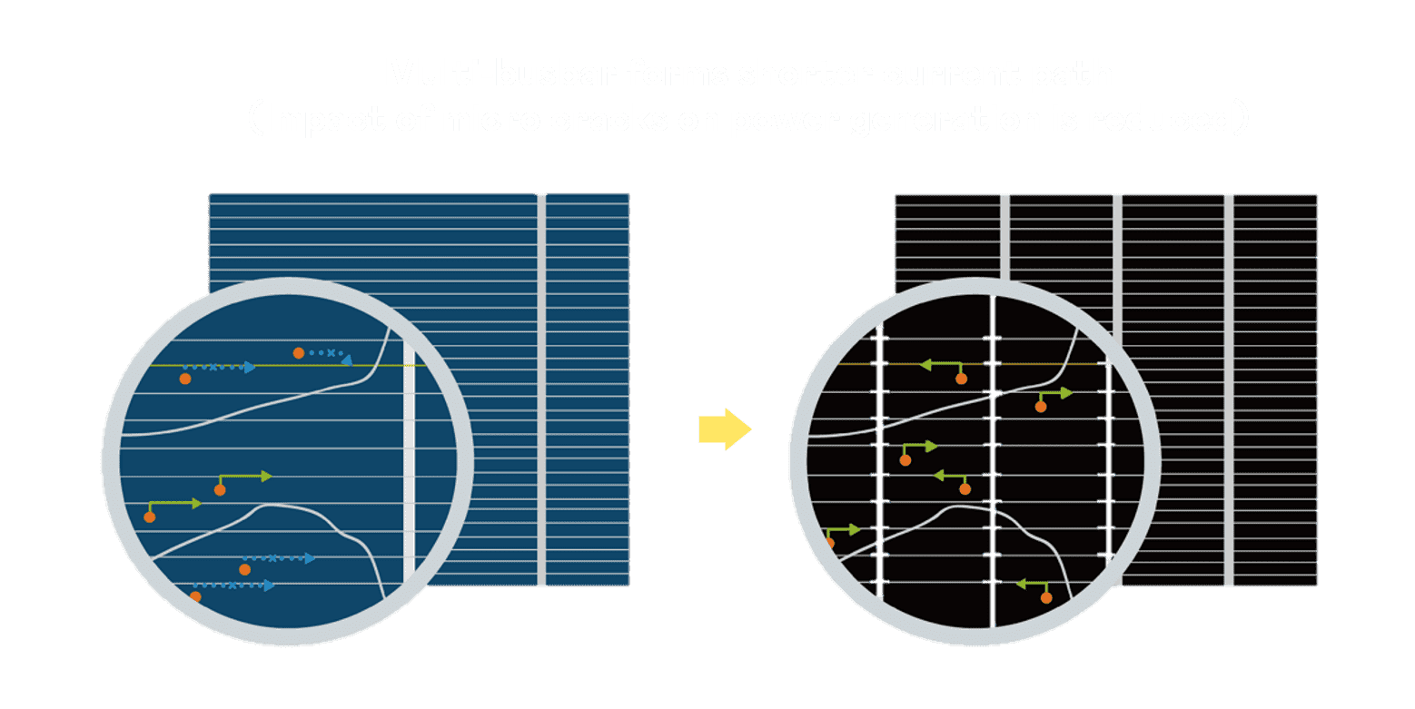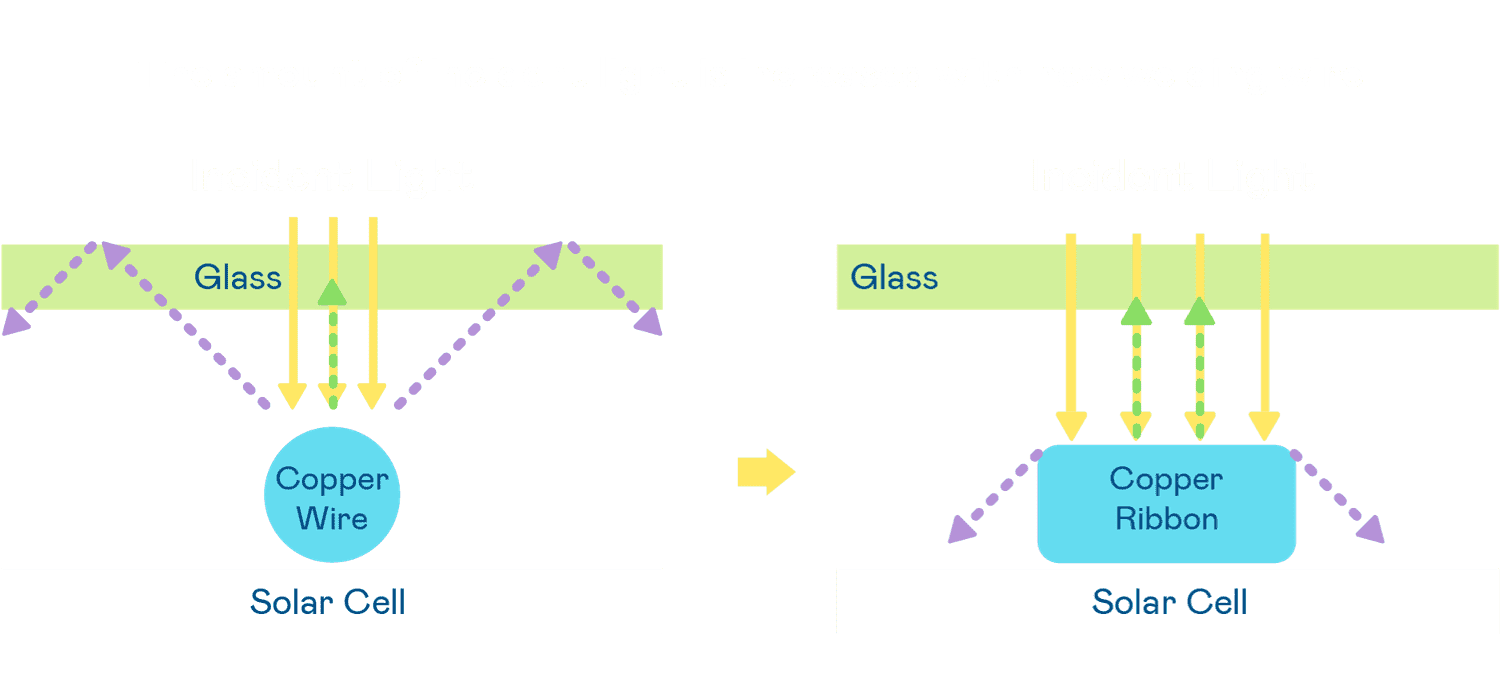 - 电池使用多条铜导线 (Copper wire) 于电池片上形成较短的电流路径,,,,提高电流收集效率,,,,采用圆形设计的铜导线较传统扁平式的铜焊带 (Ribbon),,,可增加入射至电池的光线量。。。。