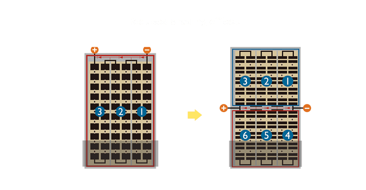 - 结合半切电池,,,,降低遮阴影响、、、、提升模组抗隐裂能力、、、、并减少电阻损耗,,进一步提升模组发电效能。。