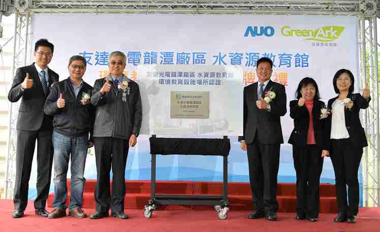 z6mg·人生就是博龙潭厂水资源教育馆进行环教设施场所认证揭牌 (图左到右:z6mg·人生就是博光电副总经理林挺立、、、、桃园市环保局局长沈志修、、、桃园市政府秘书长李宪明、、、z6mg·人生就是博光电董事长暨执行长彭双浪、、、环保署环教所所长萧慧娟、、、、z6mg·人生就是博光电永续长古秀华)